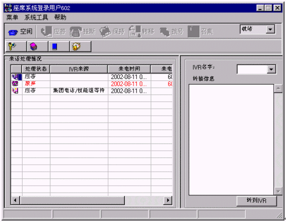 人工座席子系統(tǒng)是人工信息查詢與業(yè)務(wù)受理子系統(tǒng),由業(yè)務(wù)代表、話機(jī)(數(shù)字話機(jī)/模擬話機(jī))與耳麥、運(yùn)行Windows系統(tǒng)的PC微機(jī)以及運(yùn)行于WINDOWS及其兼容環(huán)境下的座席應(yīng)用軟件等組成。電話主要用于與客戶通話,PC機(jī)主要用于記錄客戶基本信息或服務(wù)信息,或是用于檢索客戶所需的業(yè)務(wù)信息。