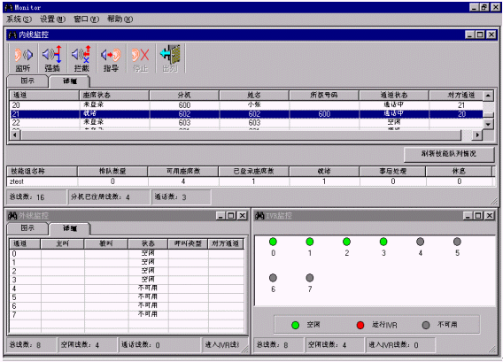 ·監(jiān)聽(tīng):班長(zhǎng)可監(jiān)聽(tīng)座席與客戶之間的通話,而座席與客戶雙方都不會(huì)察覺(jué)。