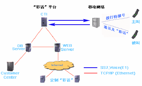 彩話業(yè)務(wù)與CRBT技術(shù)原理基本相同,當(dāng)呼叫進(jìn)入交換機(jī)后,獲取呼叫的主被叫信息后,由交換機(jī)同時(shí)發(fā)起兩個(gè)呼叫,一個(gè)去真正被叫,另一個(gè)去彩話系統(tǒng)。當(dāng)被叫方摘機(jī),首先控制主叫與被叫接通,彩話系統(tǒng)根據(jù)被叫用戶保存的定制的彩話信息和業(yè)務(wù)邏輯控制彩話系統(tǒng)的IVR單元對(duì)主被叫的通話進(jìn)行相應(yīng)的背景語音播放操作,該語音僅作為背景音樂,不影響正常的雙方通話,類似于作一個(gè)三方會(huì)議的操作。當(dāng)被叫掛機(jī)時(shí),交換機(jī)將IVR單元和被叫的連接斷開。