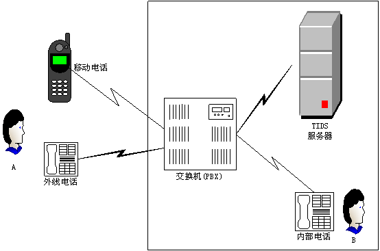 如圖1所示,在一個(gè)典型的應(yīng)用環(huán)境里,TIDS系統(tǒng)可與公司或單位的電話交換機(jī)通過(guò)一條或若干條模擬電話線相連。未來(lái)TIDS的版本將可支持E1/T1數(shù)字中繼線。可以將TIDS設(shè)置為缺省的電腦話務(wù)員,即用戶呼叫直接由TIDS系統(tǒng)處理;也可以分配一個(gè)分機(jī)號(hào)碼給TIDS,當(dāng)用戶需要時(shí)可撥該號(hào)碼使用TIDS服務(wù)。在后一種情況下,最好是在交換系統(tǒng)的問(wèn)候語(yǔ)中提示用戶如何撥打TIDS系統(tǒng)。