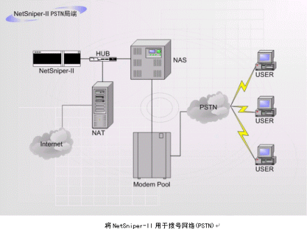 上圖中,NetSniper-II可以對(duì)網(wǎng)絡(luò)內(nèi)部各用戶(hù)進(jìn)行檢測(cè),一旦發(fā)生某個(gè)用戶(hù)安裝代理服務(wù)器軟件,其他用戶(hù)通過(guò)該用戶(hù)的接口上網(wǎng)偷逃網(wǎng)費(fèi)的情況,或發(fā)現(xiàn)盜用MAC地址上網(wǎng)及通過(guò)Modem回?fù)苌暇W(wǎng)的情況,NetSniper-II即可定位這些用戶(hù),并且采取通知系統(tǒng)管理員或自動(dòng)封堵非法用戶(hù)等措施。
