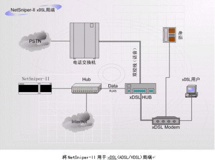 NetSniper-II也可以作為局端設(shè)備,用于xDSL(ADSL/VDSL)、PSTN(電話(huà)撥號(hào)網(wǎng)絡(luò))、HFC(有線(xiàn)電視網(wǎng)絡(luò))等。此時(shí),NetSniper-II能夠有效的防止控制共享上網(wǎng)、盜用MAC地址上網(wǎng)和Modem回?fù)苌暇W(wǎng)的情況發(fā)生。下面兩個(gè)圖例指出了如何將NetSniper-II用于局端。