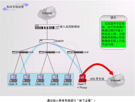 非法運(yùn)營(yíng)情況之二:如上圖中的F用戶(hù)作為運(yùn)營(yíng)商的合法包月用戶(hù),上網(wǎng)服務(wù)開(kāi)通以后,在自己的計(jì)算機(jī)中安裝代理服務(wù)軟件或者安裝路由器,這樣就可以隨時(shí)糾集若干住戶(hù)分?jǐn)偘沦M(fèi)用,甚至私設(shè)網(wǎng)吧。