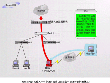 這是在企業(yè)網(wǎng)絡(luò)中常見(jiàn)的情況:如上圖中的F用戶(hù)作為企業(yè)的合法用戶(hù),上網(wǎng)服務(wù)開(kāi)通以后,有操作人員在F計(jì)算機(jī)中安裝代理服務(wù)軟件、NAT軟件或者安裝路由器軟件,再安裝Modem等遠(yuǎn)程接入設(shè)備。非法用戶(hù)在遠(yuǎn)端通過(guò)Modem等接入設(shè)備與網(wǎng)絡(luò)相連接。