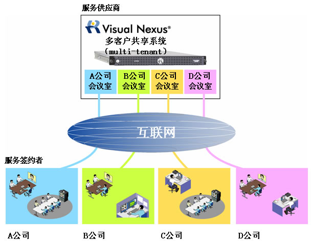 而且,包括SaaS的ASP服務(wù)需求也日益高漲,以提供視頻會(huì)議的ASP服務(wù)的服務(wù)供應(yīng)商為對(duì)象,采用了多家企業(yè)(客戶(hù))能共享視頻會(huì)議系統(tǒng)的同時(shí),又能單獨(dú)給個(gè)別企業(yè)提供服務(wù)的多客戶(hù)共享(multi-tenant)功能。從而實(shí)現(xiàn)系統(tǒng)運(yùn)用效率最大化,降低管理運(yùn)用成本。