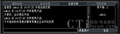 系統(tǒng)增加了多方文字互動(dòng)交流功能,在線交流功能可以選擇給所有人員發(fā)送消息,也可以選擇給某一特定人員發(fā)送。這樣在會(huì)議或培訓(xùn)的過(guò)程中,管理員可以選擇性的提出相應(yīng)的問(wèn)題給相關(guān)人員,考核相關(guān)人員的培訓(xùn)效果;其他人員也可以將會(huì)議或培訓(xùn)過(guò)程中遇到的疑問(wèn)、難點(diǎn)及時(shí)的反應(yīng)給管理員進(jìn)行解答,增強(qiáng)會(huì)議或培訓(xùn)的成效。