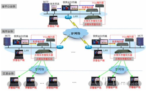 項(xiàng)目中采用了17套銳取高清錄播系統(tǒng),分別部署省國稅及下轄16個州、市國稅。銳取高清錄播系統(tǒng)采用分布式產(chǎn)品架構(gòu),由多媒體錄播服務(wù)器和前端的編碼器組成。多媒體錄播服務(wù)器部署在網(wǎng)絡(luò)機(jī)房;高清編碼器和VGA編碼器分別部署在高清視頻會議室,編碼器從華為高清視頻會議終端獲取視音頻及雙流信號,并通過IP網(wǎng)絡(luò)發(fā)送給機(jī)房內(nèi)多媒體錄播服務(wù)器,由多媒體錄播服務(wù)器實(shí)現(xiàn)視頻會議的錄制、直播和點(diǎn)播。分會場及不具備視頻會議終端的地方,可使用電腦登陸多媒體錄播服務(wù)器來接收會議的實(shí)時直播或在會后進(jìn)行點(diǎn)播。