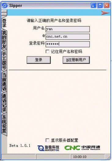 在主界面上選擇"注冊(cè)新用戶",這時(shí)會(huì)出現(xiàn)網(wǎng)通的注冊(cè)界面,選擇"開始注冊(cè)",然后將各項(xiàng)用戶信息填寫清楚后,創(chuàng)建用戶,成功后即可回到sipper界面登陸。