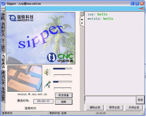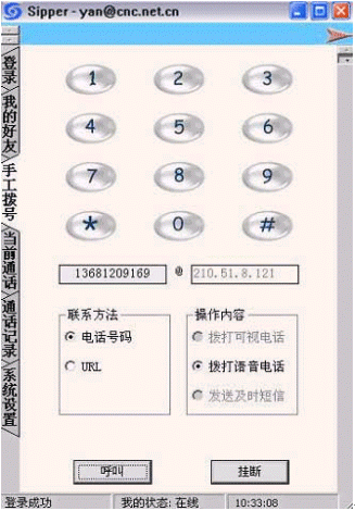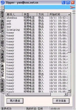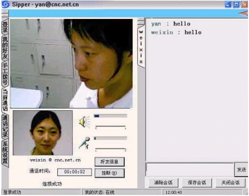 點(diǎn)擊后會(huì)出現(xiàn)對(duì)話窗口,同時(shí)在對(duì)方的機(jī)器上會(huì)出現(xiàn)你的呼叫請(qǐng)求,如果對(duì)方"接收"了你的請(qǐng)求,則兩個(gè)人的語(yǔ)音對(duì)話開始,雙方可以互相聽到聲音,沒(méi)有圖象,可以同時(shí)進(jìn)行短信交流。