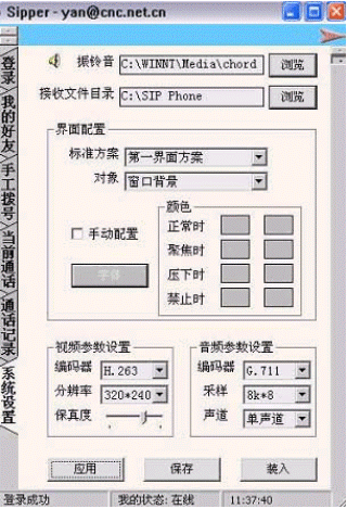 在該窗口中可以對(duì)系統(tǒng)的各項(xiàng)參數(shù)進(jìn)行設(shè)置:振玲音、接受文件目錄、界面配色方案、大小視頻等。