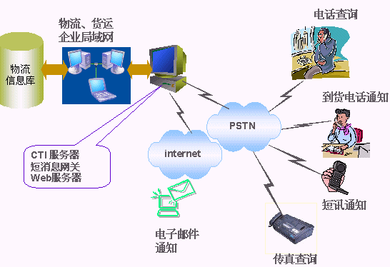 CTI服務器負責接入用戶的查詢請求,并根據用戶的要求進行貨物查詢等操作;根據企業(yè)預先設置的撥號表逐一外撥到目標用戶(貨主或收貨人)完成電話通知的功能。