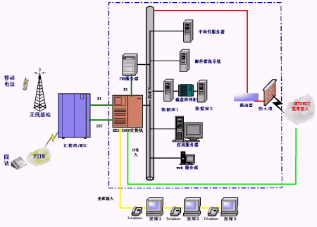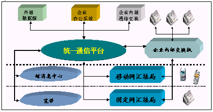 統(tǒng)一通信平臺提供了與企業(yè)內(nèi)部交換機(jī)(PBX)或PSTN,寬帶或INTERNET和GSM或GPRS網(wǎng)絡(luò)的接口,融合了多種網(wǎng)絡(luò)資源和企業(yè)內(nèi)部數(shù)據(jù)源。為用戶提供了多種服務(wù)界面:WEB界面、人工服務(wù)界面,IVR界面。同時(shí)為用戶提供短信息等數(shù)據(jù)業(yè)務(wù)。