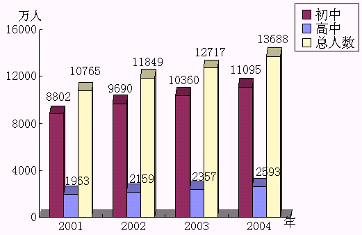 據(jù)國家最新統(tǒng)計(jì)資料分析,2001年中學(xué)學(xué)生人數(shù)已達(dá)10765萬人,而且學(xué)生人數(shù)還在快速增長。初中學(xué)生人數(shù)以每年6.5%的速度增長,普通高中學(xué)生人數(shù)也以每年10%-11%的速度增長。