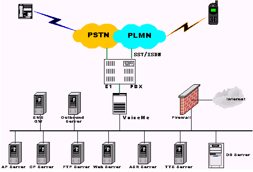 整個(gè)系統(tǒng)平臺(tái)前端接入可直接從電信或移動(dòng)交換機(jī)提供的信號(hào)接入,如中國(guó)一號(hào)、SS7以及ISDN等,通過(guò)PBX連入平臺(tái)核心VoiceMe服務(wù)器,系統(tǒng)接入容量可擴(kuò)至幾十個(gè)乃至上百個(gè)E1接入。系統(tǒng)主要包括語(yǔ)音控制、多媒體應(yīng)用和內(nèi)容管理等部分,其中主要包括: