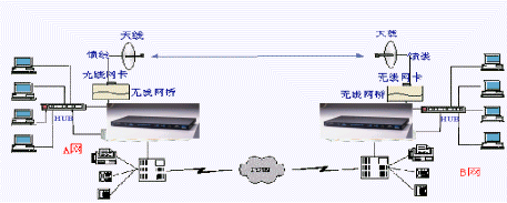 A網(wǎng)與B網(wǎng)分別為兩個局域網(wǎng),通過兩臺WavePoint II無線網(wǎng)橋?qū)蓚局域網(wǎng)連在一起,網(wǎng)橋上的RJ45口或BNC細(xì)纜接口與局域網(wǎng)相連。每臺網(wǎng)橋上插有一塊WaveLAN無線PC卡,PC卡的射頻輸出端口,通過饋線接到天線,通過PC卡來完成無線鏈路的連通。無線網(wǎng)橋連接完成后的效果類似HUB級連。IP語音網(wǎng)關(guān)-HGW-904的局域網(wǎng)接口(RJ45)連接到局域網(wǎng)的HUB上,根據(jù)用戶實際的話務(wù)量,選用Line端口接入用戶電話交換機(jī)(PBX),PBX接普通電話機(jī)和傳真機(jī),并連接至電話公網(wǎng)(PSTN)。其中所需設(shè)備:HGW-904