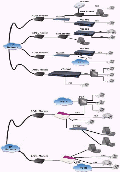 總部采用可堆疊的VG-2000,通過IP網(wǎng)絡(luò)(互聯(lián)網(wǎng))同各中心或分支機(jī)構(gòu)的相連,利用PBX(小型電話交換總機(jī))的交換能力將話音自動轉(zhuǎn)到VG-2000上,通過數(shù)據(jù)專線、VPN或Internet傳輸?梢栽赩G-2000上進(jìn)行流量控制(Bandwidth