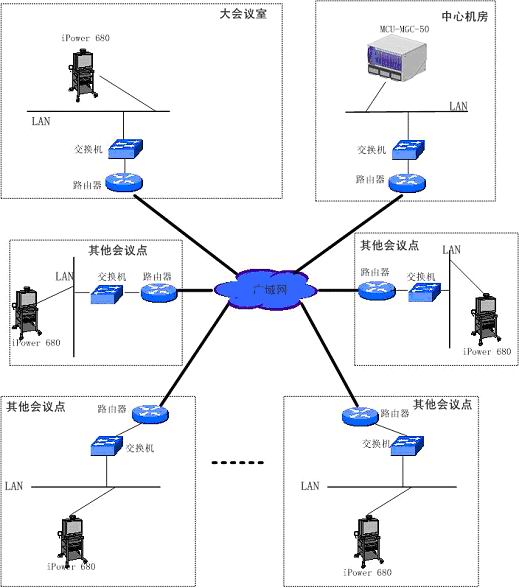用戶將組建以多點(diǎn)控制單元MCU為中心,采用H.323 IP連接方式的H.323標(biāo)準(zhǔn)會議電視網(wǎng),端口速率為768kbps,多點(diǎn)控制單元要求的容量是可達(dá)到48個節(jié)點(diǎn)的同時接入。