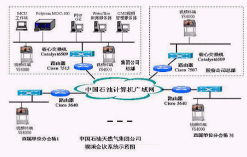 中國石油天然氣集團公司視頻會議系統(tǒng)采用美國寶利通(Polycom)公司的VS4000會議室型視頻終端及MGC-100多點會議服務(wù)器。以集團公司、股份公司為中心,通過數(shù)字傳輸信道,以專線方式星形級聯(lián)而成。