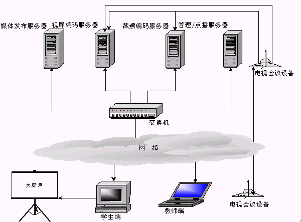 當(dāng)老師端在異地時(shí)(攝像頭離服務(wù)器較遠(yuǎn),無法物理連接),可通過"電視會議系統(tǒng)"將老師的圖像及聲音實(shí)時(shí)傳送到編碼服務(wù)器,桌面課件可以通過PcAnywhere傳送到編碼服務(wù)器。圖像,聲音和桌面課件通過Web Streaming采集壓縮并在網(wǎng)上實(shí)時(shí)廣播。這種系統(tǒng)架構(gòu)也是當(dāng)今功能比較齊全和完善的一種實(shí)現(xiàn)方式。