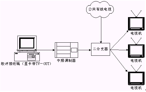 本系統(tǒng)接收端接收實(shí)時(shí)廣播時(shí),除了用普通PC機(jī)收看,或把PC機(jī)接收到的信號輸?shù)诫娨暎ù笃粒┥鲜湛,甚至還可以接入有線電視網(wǎng)進(jìn)行播放。具體方法是通過一個接收端接收股評節(jié)目,通過帶TV-OUT的顯卡把TV信號輸出到中頻調(diào)制設(shè)備,中頻調(diào)制設(shè)備可以把基帶模擬信號轉(zhuǎn)換成一個有線電視信號,且傳輸距離遠(yuǎn),損失小,再把這個信號與有線電視信號一起接入一個二分支器(2進(jìn)1出),這就可以和公共有線電視共存,形成自己的頻道,供電視接收。