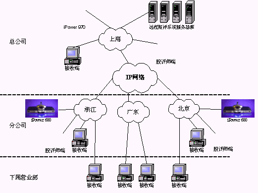 某證券公司有三級網(wǎng)絡(luò),總公司、分公司和下屬營業(yè)部?偣镜椒止編捠2M,在總公司配置一套會議室型電視會議終端POLYCOM 970和一套多點(diǎn)會議服務(wù)器Radvision ViaIP400。在分公司配置了38套會議室型電視會議終端POLYCOM 680,用于與總公司進(jìn)行雙向視頻會議。分公司到營業(yè)部帶寬是512K,各營業(yè)部安裝遠(yuǎn)程股評系統(tǒng)接收端程序,遠(yuǎn)程股評系統(tǒng)服務(wù)器都放置在海通總公司。當(dāng)在總公司進(jìn)行股評時(shí),總公司本地?cái)z像頭拍攝教師畫面,MIC采集教師聲音,傳給服務(wù)器編碼,再通過網(wǎng)絡(luò)供各個接收端接收;當(dāng)在分公司進(jìn)行股評時(shí),首先分公司的電視會議設(shè)備采集教師畫面及聲音傳回總公司的電視會議設(shè)備,再傳給遠(yuǎn)程股評系統(tǒng)的服務(wù)器進(jìn)行編碼,然后通過網(wǎng)絡(luò)發(fā)布,供接收端接收。(結(jié)構(gòu)如下圖)