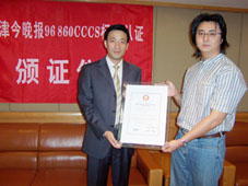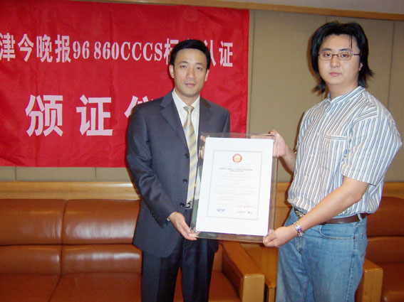 2004年9月9日,天津今晚報公眾服務(wù)中心通過了《全國呼叫中心運營績效標準》(CCCS-OP-2003)認證,并獲得由中國信息化推進聯(lián)盟客戶關(guān)系管理專業(yè)委員會頒發(fā)的認證證書(四星級客戶服務(wù)中心),成為國內(nèi)傳媒業(yè)首家通過此認證的呼叫中心。