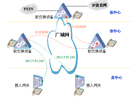 針對(duì)這種體系結(jié)構(gòu),軟交換技術(shù)就大有可為了,各地市布置軟交換設(shè)備,其間采用H.323/SIP點(diǎn)對(duì)點(diǎn)局間協(xié)議,負(fù)責(zé)各軟交換機(jī)之間的通信,在地市到縣區(qū)之間采用MGCP/H.248協(xié)議,這種協(xié)議體系充分吸取了軟交換體系控制與業(yè)務(wù)分離的思想,具有高度靈活性,可以兼容PSTN、運(yùn)營(yíng)商IP語(yǔ)音網(wǎng)、原有PBX系統(tǒng)等,并且從多方面保障話音質(zhì)量;管理上由地市軟交換設(shè)備對(duì)縣區(qū)的接入網(wǎng)關(guān)設(shè)備進(jìn)行統(tǒng)一管理,號(hào)碼進(jìn)行統(tǒng)一分配;同時(shí),由地市軟交換設(shè)備提供多達(dá)數(shù)十種增值業(yè)務(wù),可以實(shí)現(xiàn)業(yè)務(wù)的統(tǒng)一升級(jí),簡(jiǎn)單方便。
