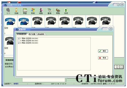 在系統(tǒng)操作控制區(qū) 選擇【系統(tǒng)】 , 系統(tǒng)彈出如下系統(tǒng)設置對話框,您將在系統(tǒng)設置對話框內能看到【系統(tǒng)設置】頁: 【錄音磁盤選擇】選擇錄音文件存放的盤符; 如圖所示