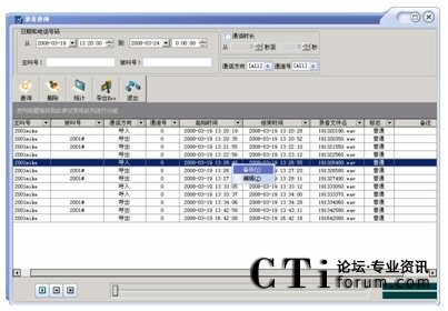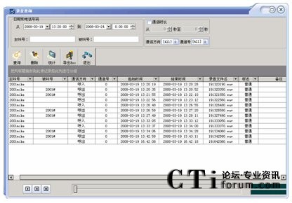 可按通道號,日期,時間,撥出/入電話號碼等多種方式進行單個和組合查詢,查詢方便快捷,數據表的下邊還顯示出數據資料的統(tǒng)計。并可根據通話內容及聯(lián)系人等重要信息對錄音文件進行編輯?梢匀我獠シ乓粋錄音或選擇多個錄音依次播放,放音時將彈出當前語音文件的放音進度等信息。