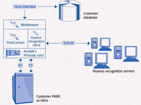 Prosody板卡位于系統(tǒng)的底層,已集成在VeCab系統(tǒng)中。FristContact 媒體服務(wù)器與Prosody硬件的通信是通過(guò)Aculab的統(tǒng)一API實(shí)現(xiàn)的。Prosody不僅用于TTS,而且也用于其它語(yǔ)音處理功能,例如放音、錄音、回音消除和DTMF檢測(cè)和生成。此外,VeCab 使用 Aculab的高密度數(shù)字網(wǎng)絡(luò)接口模塊來(lái)連接ACT的電話(huà)系統(tǒng)。