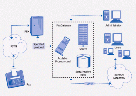 FaxGateway控制傳真發(fā)送和接收任務(wù)的調(diào)度。Prosody的數(shù)字網(wǎng)絡(luò)接口模塊可使FaxGateway以特定的協(xié)議與PBX連接并工作。一旦呼叫接續(xù)成功,Aculab的G3傳真軟件可將采用TIFF格式的圖形文件傳送至接收端。