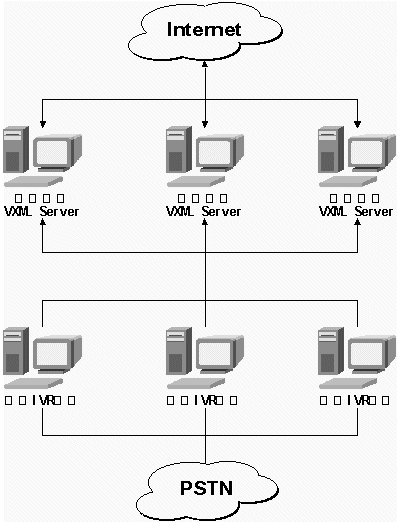 在數(shù)據(jù)中心設(shè)置VXML服務(wù)器,提供訪問互聯(lián)網(wǎng)絡(luò)的接口,地市臺與中心服務(wù)器使用標準的基于應(yīng)用層的協(xié)議通訊。地市臺與數(shù)據(jù)中心交換網(wǎng)頁和其他數(shù)據(jù),這種交換是實時的。各地市的電話用戶就能利用運營商提供本地電話號碼訪問互聯(lián)網(wǎng)上的信息。