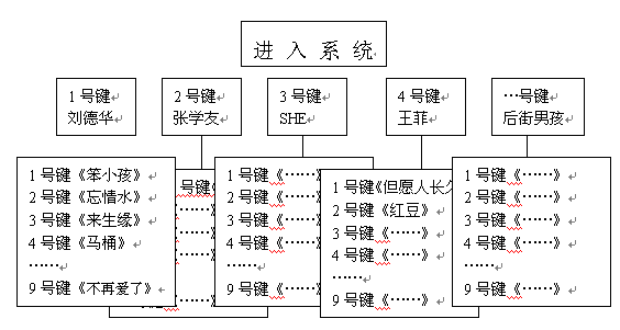 眾所周知,目前大多數(shù)電話機(jī)和手機(jī)的操作鍵盤都只有0-9十個(gè)數(shù)字鍵和*號(hào)和#號(hào)兩個(gè)符號(hào)鍵,因此在設(shè)計(jì)導(dǎo)航菜單的時(shí)候很受限制。比如在點(diǎn)歌節(jié)目中,用這些數(shù)字鍵來指代上千首歌曲是根本不可能的。以前多采用的方法有兩種:一是預(yù)先給用戶發(fā)送歌曲手冊(cè),上面可以查到每首歌曲的代號(hào)。這種方式的缺點(diǎn)是實(shí)時(shí)性差,不能隨時(shí)更新歌曲庫。另外印刷宣傳資料帶來的人力和成本也不容忽視;另一種方法是將歌曲根據(jù)歌手、主題進(jìn)行分類,比如下圖所列的結(jié)構(gòu):