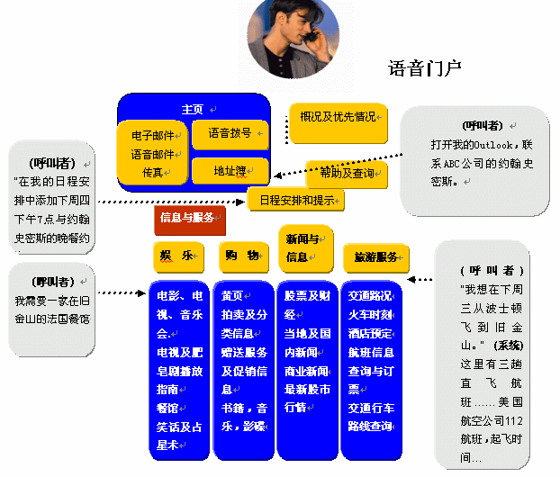 基于在語音識(shí)別技術(shù)準(zhǔn)確度上已有突破性的進(jìn)展,因此可以利用語音,不僅僅是改變?cè)械逆I盤輸入查詢方式,而且能夠使自動(dòng)應(yīng)答系統(tǒng)處理更加復(fù)雜的情況。用戶撥打服務(wù)電話的時(shí)候,只需說出他/她的需求即可。如在電子黃頁業(yè)務(wù)中,用戶要查詢關(guān)于A公司的情況,服務(wù)電話接通以后就可以直接說出"A公司",而不要按鍵通過一層層的菜單目錄,然后系統(tǒng)就能自動(dòng)播報(bào)出該單位介紹信息和聯(lián)系方式等。