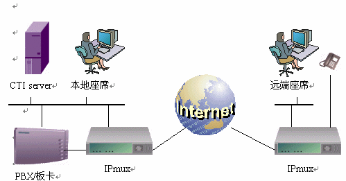 圖中,IPmux設備通過互聯(lián)網(wǎng)透明傳送電話線路上的摘機、掛機、振鈴、話音、信號音、DTMF、Caller-ID、FAX等數(shù)據(jù)和信號。通過采用冗余、糾錯技術(shù),可以保證實時、可靠地傳送這些數(shù)據(jù)。