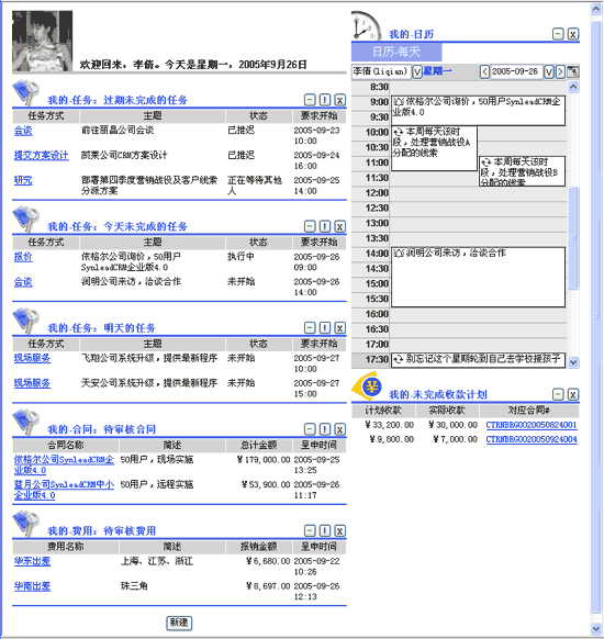 右側(cè)區(qū)域?yàn)橄到y(tǒng)限定的加載分組,例如“我的-日歷”、“我的-未完成收款計(jì)劃”。對(duì)于“我的-日歷”,您可以所見(jiàn)即所得地管理日程安排,十分方便地對(duì)日程事件拖拖拽拽。