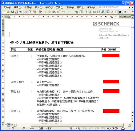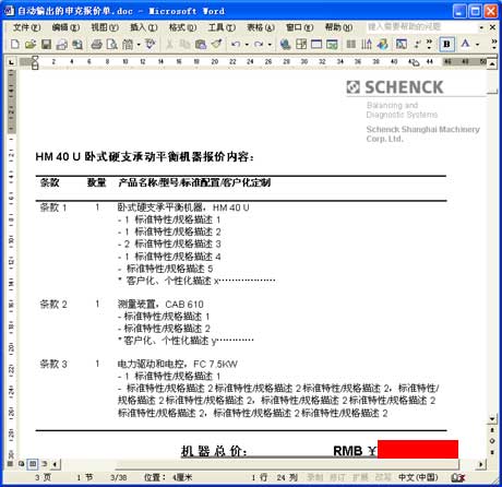 以上海申克的報(bào)價(jià)單為例。與其說(shuō)它是一份報(bào)價(jià)單,不如說(shuō)它是一套幾十頁(yè)的客戶(hù)化復(fù)雜方案書(shū),它由各方面數(shù)據(jù)和文檔自動(dòng)合并、輸出為一份Word文件: