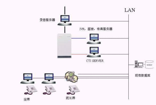 按照用友北京分公司行業(yè)特點(diǎn)、現(xiàn)狀和需求,呼叫中心系統(tǒng)采用愛(ài)立信MD110交換機(jī),加配CTI接口設(shè)備,配合我公司的CTILink和IVR服務(wù)器,實(shí)現(xiàn)呼叫中心的全部功能。該系統(tǒng)中繼線采用數(shù)字中繼線(30B+D),16路IVR系統(tǒng)和20個(gè)人工坐席,處理用戶申告業(yè)務(wù)。