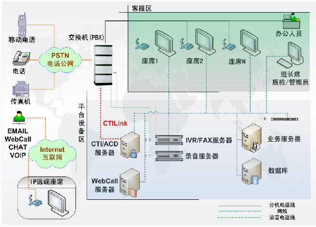 包含了PBX、CTI服務(wù)器、IVR/FAX服務(wù)器、錄音監(jiān)控 系統(tǒng)、報表統(tǒng)計系統(tǒng),CRM客戶管理等。