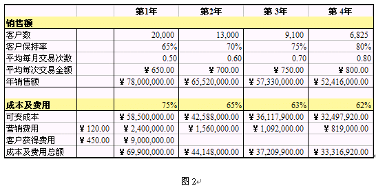 第1年,平均每個(gè)客戶每個(gè)月交易的次數(shù)是0.50次,平均每次的交易金額是¥650.00,因此第1年的銷售額是¥650.00*(0.5次/月*12個(gè)月)*20,000