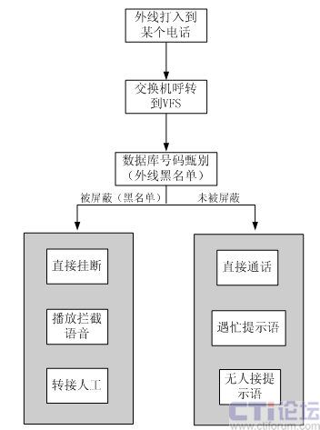 - 系統(tǒng)利用交換機的話音轉(zhuǎn)移功能,將轉(zhuǎn)移過來的來話信息進(jìn)行過濾處理,從而實現(xiàn)語音攔截的功能。