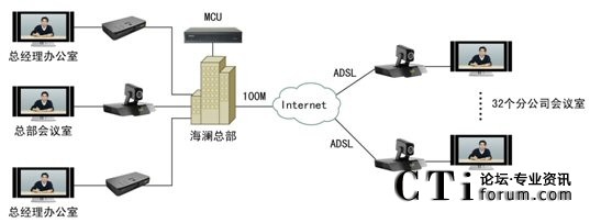 2009年6月,領(lǐng)先的視訊廠(chǎng)商科達(dá)攜TrueSens(致勝)視頻會(huì)議系統(tǒng)走進(jìn)海瀾,為海瀾集團(tuán)搭建了一套覆蓋總部2個(gè)領(lǐng)導(dǎo)辦公室、1個(gè)銷(xiāo)售會(huì)議室及全國(guó)32個(gè)分公司的視頻會(huì)議系統(tǒng)。整個(gè)方案在部署上非常便捷,海瀾江陰總部的機(jī)房架設(shè)一臺(tái)高、標(biāo)清一體化多點(diǎn)控制單元(MCU),銷(xiāo)售會(huì)議室、集團(tuán)王總、陶總的辦公室以及海瀾集團(tuán)在全國(guó)的32個(gè)分公司銷(xiāo)售會(huì)議室則各部署一套視頻會(huì)議終端?偛繋挒100M,分支機(jī)構(gòu)則均通過(guò)普通ADSL接入。系統(tǒng)拓?fù)鋱D如下: