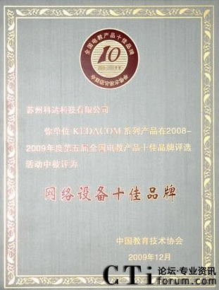 CTI論壇(ctiforum)12月14日消息(記者 張塵):2009年12月4日,由國(guó)內(nèi)教育權(quán)威機(jī)構(gòu)“中國(guó)教育技術(shù)協(xié)會(huì)”主辦,以讀者調(diào)查問(wèn)卷的形式舉行的第五屆全國(guó)電教產(chǎn)品十佳品牌頒獎(jiǎng)典禮在福州梅峰賓館盛大開幕,科達(dá)教育視頻會(huì)議產(chǎn)品憑借卓越的產(chǎn)品性能和良好的客戶服務(wù)入選網(wǎng)絡(luò)產(chǎn)品類十佳之列,同時(shí)也成為首個(gè)入選十佳品牌的視頻會(huì)議產(chǎn)品。