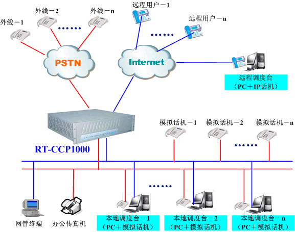 融天科技一體化IP調(diào)度指揮系統(tǒng)RT-CCP1000充分融入了先進(jìn)的VOIP技術(shù),支持遠(yuǎn)程IP用戶接入/遠(yuǎn)程調(diào)度模式,該調(diào)度系統(tǒng)可廣泛地適用于部隊(duì)、鐵路、水力、電力、航空、礦山、石油、冶金、化工等企業(yè)與單位,系統(tǒng)組網(wǎng)圖大致如下: