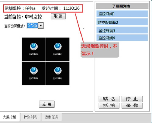 監(jiān)控計劃規(guī)定了監(jiān)控系統(tǒng)何時以何種方式在大屏上顯示多個現(xiàn)場的監(jiān)控畫面。監(jiān)控畫面可輪詢,可調(diào)整設(shè)置畫面分屏顯示模式;可以固定在某位置顯示某監(jiān)控畫面;可以切換到險情聯(lián)動監(jiān)控模式?梢耘c監(jiān)控畫面喊話;監(jiān)控錄像;保存畫面等功能。