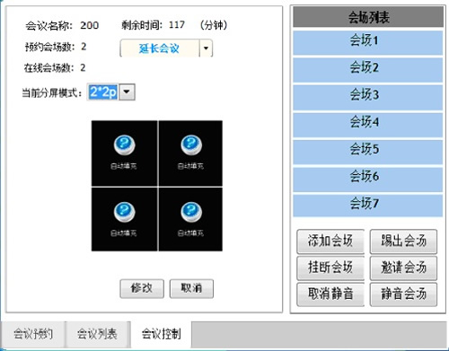 添加一個會場到當前會議當中。點擊“添加會場”按鈕,會出現(xiàn)彈屏,雙擊會場完成添加。