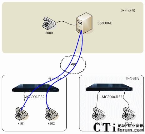 圖一:方案1:SS3000-E與IPPBX MG3000-R32聯(lián)合組網(wǎng)示意圖
