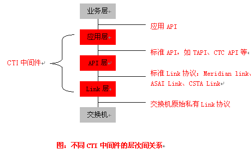 API層產品:實現(xiàn)把標準Link協(xié)議轉化為標準的API,如CTC API、TAPI、JTAPI等,為CTI應用開發(fā)提供一套標準的API,屏蔽了不同交換機擁有的CTI協(xié)議和CTI接口,使應用程序員無需關心消息是如何在計算機和交換機之間傳遞,專注于客戶端的應用開發(fā),實現(xiàn)應用程序與交換機平臺無關性。