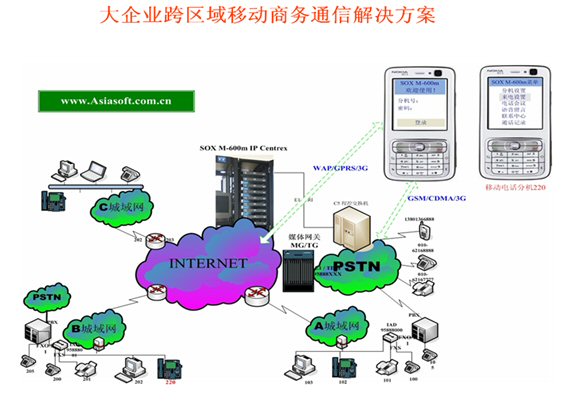 SOX-M融合通信移動(dòng)總機(jī)系統(tǒng)通過與運(yùn)營(yíng)商N(yùn)GN的互聯(lián)互通的接入實(shí)現(xiàn)企業(yè)總機(jī)號(hào)碼的規(guī)劃(如固網(wǎng)可以放固網(wǎng)PSTN號(hào)碼,移動(dòng)可以放移動(dòng)GSM或CDMA號(hào)碼),并通過一系列WEB管理界面實(shí)現(xiàn)各種業(yè)務(wù)功能的快速開通和企業(yè)的自服務(wù)WEB界面管理分機(jī)特性,由于SOX-M系統(tǒng)是移動(dòng)軟交換SOFTSWITCH的設(shè)計(jì)理念和實(shí)現(xiàn)原理,采用支持SIP/H.323等協(xié)議,并設(shè)計(jì)出核心的移動(dòng)分機(jī)交換模塊,實(shí)現(xiàn)移動(dòng)電話(手機(jī))綁定分機(jī)號(hào)碼完全實(shí)現(xiàn)了“移動(dòng)隨身分機(jī)”(這樣的分機(jī)之間可任意轉(zhuǎn)接,可聽取留言Voice Mail,可發(fā)起WAP電話會(huì)議,可訪問企業(yè)的CRM、ERP等應(yīng)用軟件并集成點(diǎn)擊呼叫等等)。不僅移動(dòng)運(yùn)營(yíng)商可以替代第一代的移動(dòng)總機(jī),固網(wǎng)運(yùn)營(yíng)商采用SOX-M移動(dòng)軟交換也可以輕松的開展移動(dòng)總機(jī)(小靈通或手機(jī))的業(yè)務(wù)了,但SOX-M系統(tǒng)融合移動(dòng)運(yùn)營(yíng)商的無線互聯(lián)網(wǎng)數(shù)據(jù)業(yè)務(wù)將產(chǎn)生更大的利于企業(yè)應(yīng)用的前景,移動(dòng)總機(jī)(語音+WAP)的融合應(yīng)用成為第二代移動(dòng)總機(jī)殺手級(jí)應(yīng)用,令移動(dòng)總機(jī)如虎添翼。