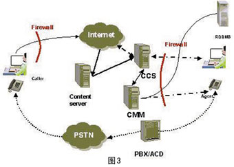 ----圖2說(shuō)明了在集成互聯(lián)網(wǎng)電話網(wǎng)關(guān)時(shí)進(jìn)行協(xié)同會(huì)話的流程,圖中實(shí)線為數(shù)據(jù)信息傳遞的鏈路,虛線為語(yǔ)音傳遞的鏈路。通過(guò)ITG和PBX/ACD 的特定交互接口,將呼叫中心外部的IP電話鏈路集成到CCIS系統(tǒng)中。值得注意的是,ITG 和CCS需要安裝在企業(yè)防火墻的外側(cè),以方便呼叫者的訪問(wèn)。